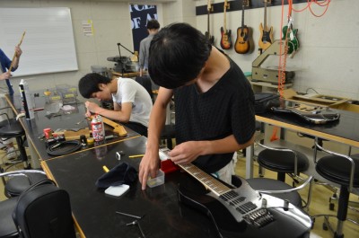 7階は弦楽器リペアの授業中。様々な道具を使い楽器を最高の状態に磨きあげます。まさに職人。