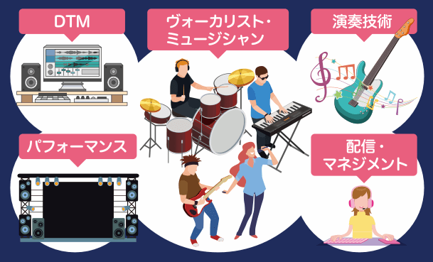 自身がメインで学びたいパートを選択し、プロとして通用する演奏技術や歌唱技術を学びます。また、学んだ表現力をしっかり作品として残すことができるクリエーターとしてのスキルも培い、4年間を通じて次世代に必要なアーティストを育てます。
